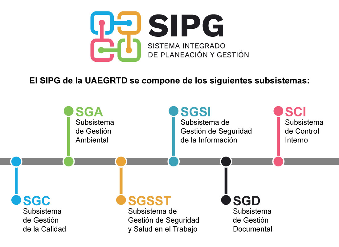 El Sistema Integrado de Planeación y Gestión - SIPG de la UAEGRTD es una herramienta gerencial que integra seis modelos referenciales cuyo propósito es la mejora continua del desempeño institucional a partir del cumplimiento de los requisitos establecidos para cada modelo, tomando como marco general el Modelo Integrado de Planeación y Gestión (MIPG).