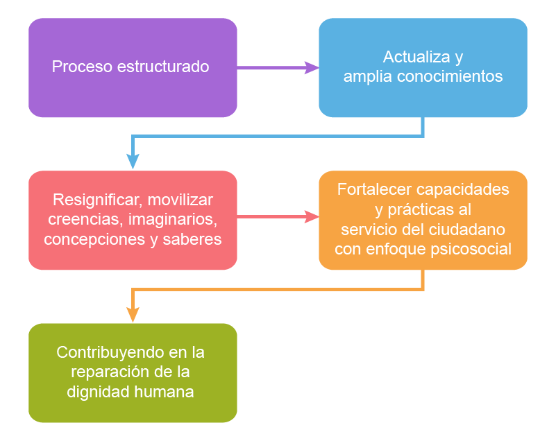 La cualificación del talento humano se concibe como un proceso estructurado en el que las personas actualizan y amplían sus conocimientos, resignifican y movilizan sus creencias, imaginarios, concepciones y saberes, y fortalecen sus capacidades y prácticas cotidianas con el propósito de buscar la eficiencia administrativa y la atención con un enfoque psicosocial al servicio del ciudadano que “privilegia las acciones tendientes a contribuir en la reparación de la dignidad humana, generando condiciones para el ejercicio autónomo de las personas y las comunidades en la exigencia de los derechos y devolver a estas la independencia y el control sobre sus vidas y sus historias, entre otras cosas por que reconoce y valida las potencialidades y capacidades con las que cuentan para recuperarse y materializar sus proyectos de vida” (msps,2017b).