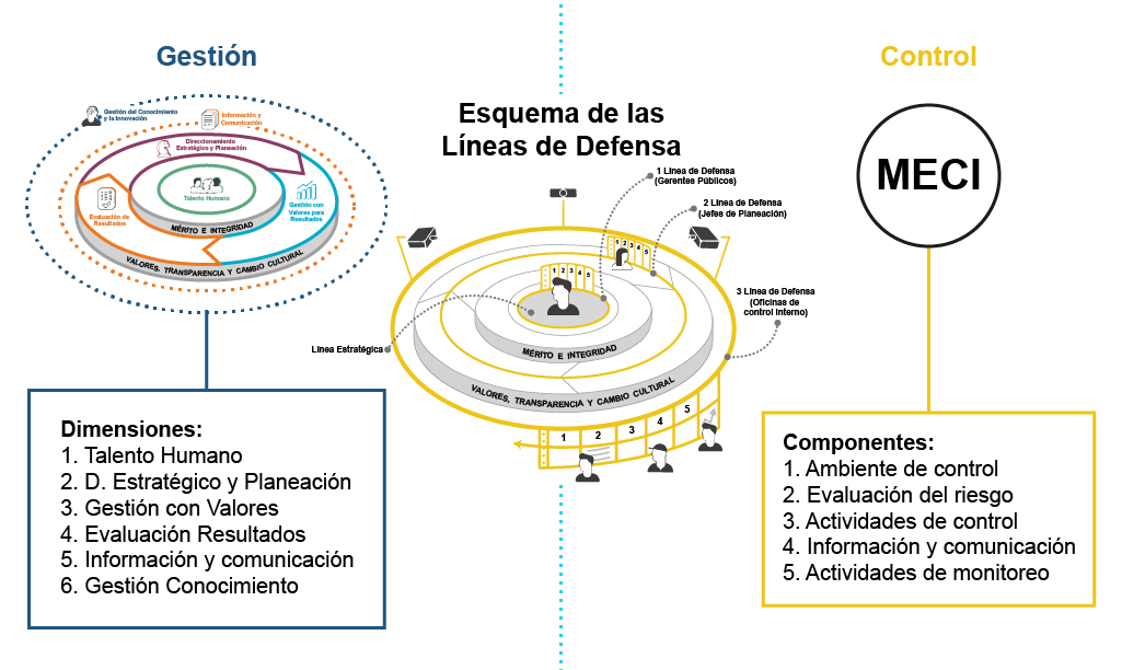 Conforme a lo establecido en el Decreto 1499 de 2017, se crea un solo Sistema de Gestión para las entidades públicas, integrando el Modelo Estándar de Control Interno (MECI) como la 7a dimensión del Modelo Integrado de Planeación y Gestión (MIPG). Dicha dimensión se compone de cinco componentes y un esquema de responsabilidades por líneas de defensa, tal como se muestra a continuación.