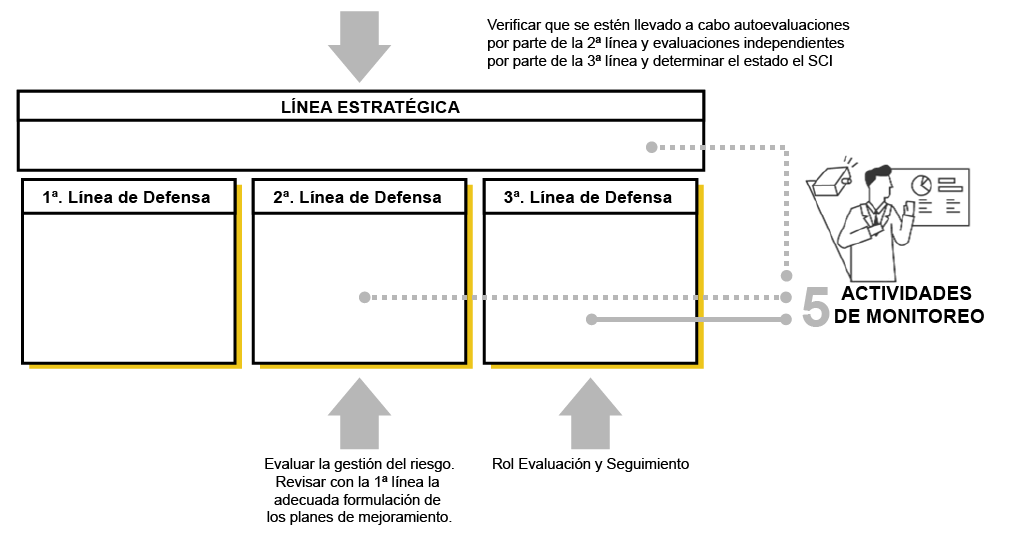 Busca que la entidad haga seguimiento oportuno al estado de la gestión de los riesgos y los controles, esto se puede llevar a cabo a partir de dos tipos de evaluación: concurrente o autoevaluación y evaluación independiente.